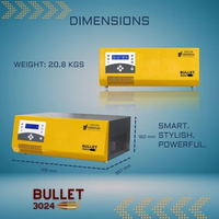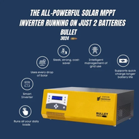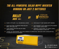 Statcon Energiaa’s Bullet Solar PCU is India’s most compact and feature-filled inverter designed to run all the heavy household loads. Bullet, as it is called, charges your batteries at a lightning-fast speed from both Grid and PV. Bullet 3024 is Smart, Rough and Tough, and made to last against daily misuse. With a rugged and aesthetically appealing all-metal shell, Bullet 3024 sustains ~50% more loads than other competing household inverters.